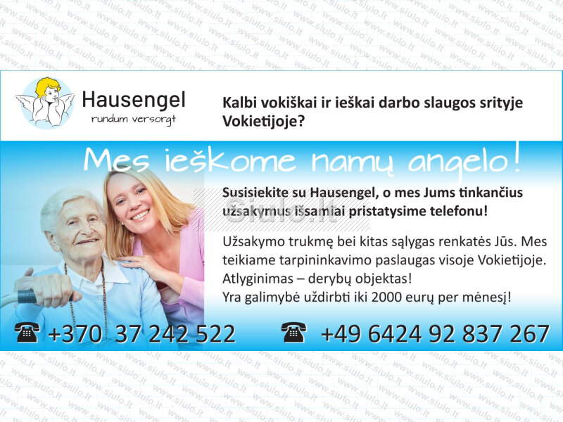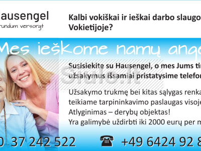 Pagyvenusių žmonių priežiūra bei pagalba buityje jų namuose Vokietijoje. Darbas individualios veiklos pagrindu, todėl siūlome patrauklias darbo bei apmokėjimo sąlygas. Įmonė pasirūpina visų formalumų tvarkymu, vokiškais draudimais, kelione į Vokietiją bei konsultuoja visais iškilusiais klausimais. Platus darbo vietų pasirinkimas visoje Vokietijoje. Uždarbio galimybės nuo 1800 eurų iki 2800 eurų.