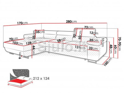išmatavimai 170x280 cm. aukštis nuleistom /pakeltom/pagalvem 70/90 cm,