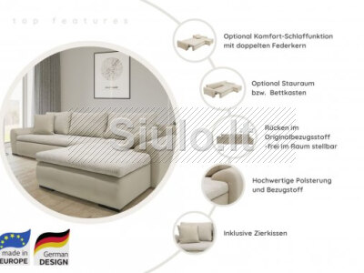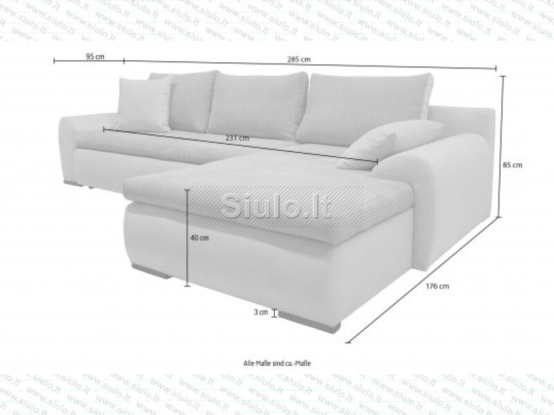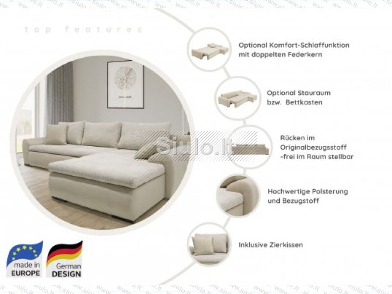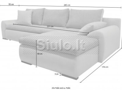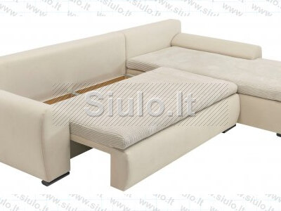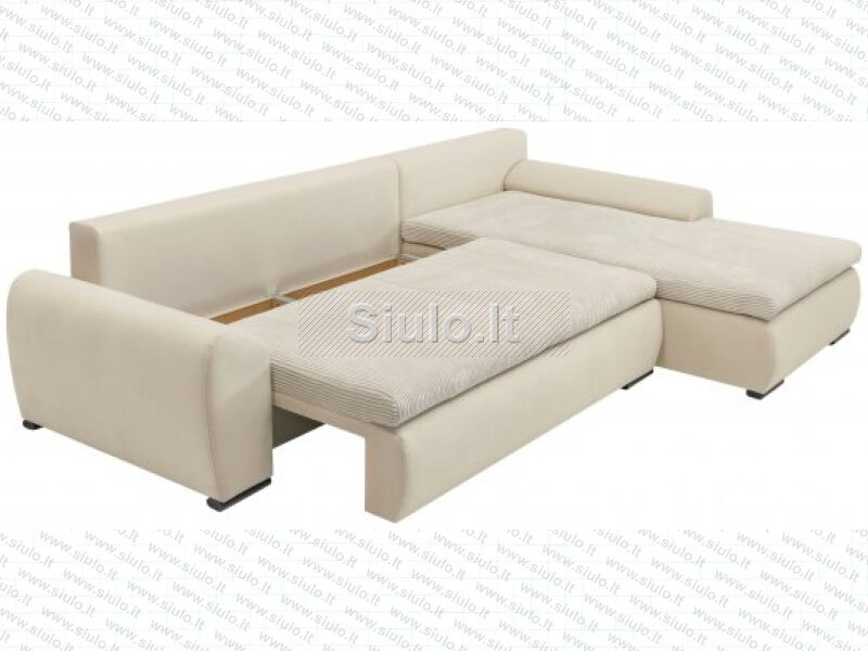 Kampas turi miegamą funkciją ir patalynės dėžę,keičiama kampo pusė. Ilga gulima vieta