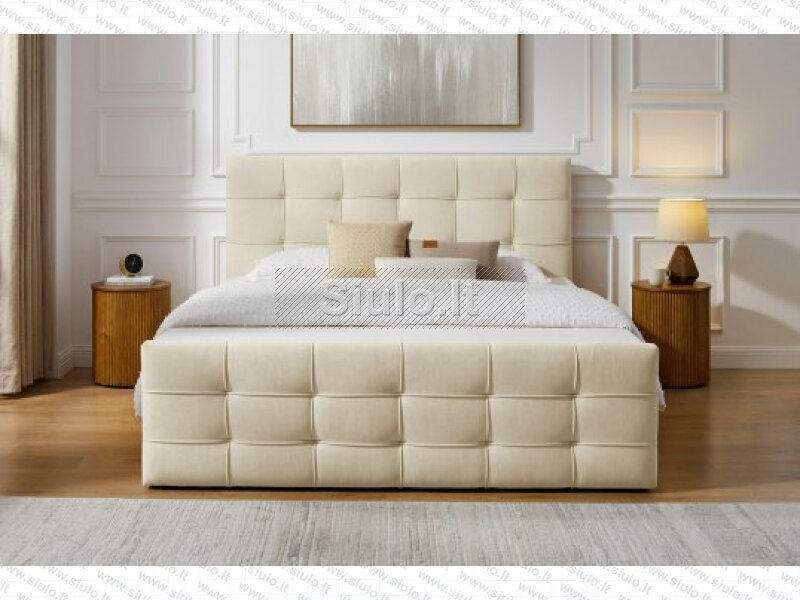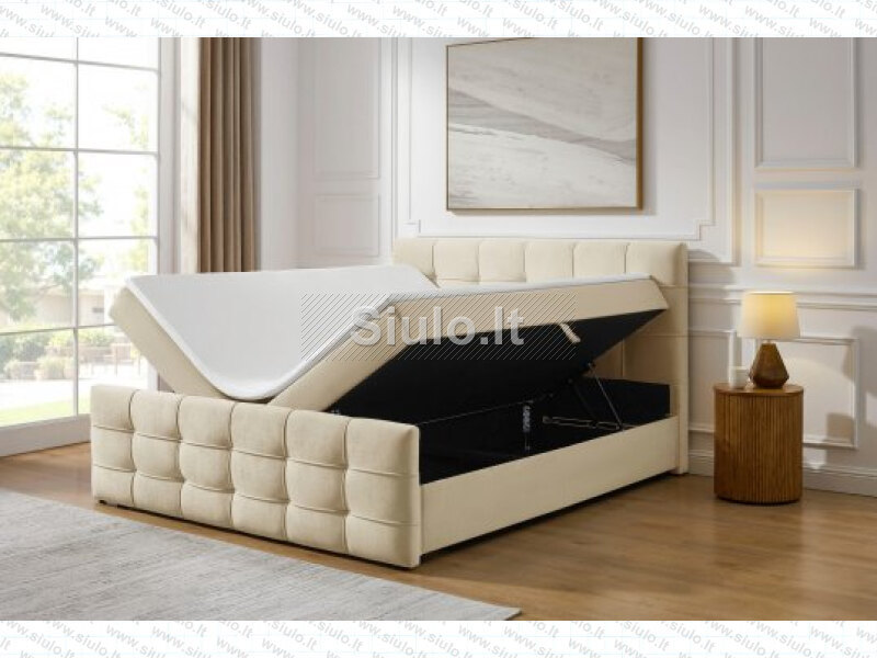Lova dengta audiniu,lova turi iš šonu atsidarančias dideles patalynės dėžes.Lovos komplektuojamos su čiužiniu.Lova aukšta patogi atsikelti įvairaus amžiaus žmonėms.