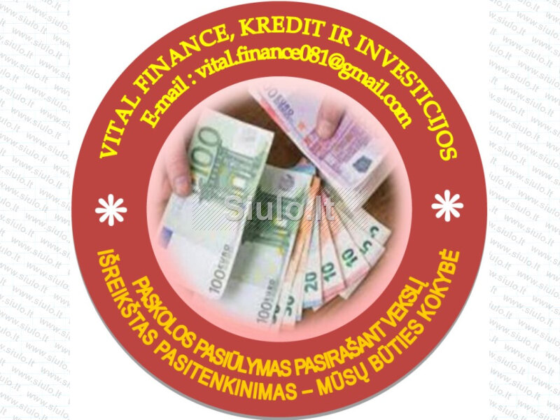 Visos Lietuvos laukia puiki galimybė pradėti naują gyvenimą harmonijoje su finansine pagalba, siekiant geresnės ir labai palankios padėties tiems, kurie susiduria su finansiniais sunkumais. Siūlome paskolas nuo 3 000 iki 150 000 eurų, kurių mėnesinė įmoka yra 55 eurai. Garantuojame, kad būsite patenkinti per 24 valandas nuo teisinių dokumentų, kurie išduodami ir pasirašomi internetu, gavimo. Jei vis dar domitės paskolos gavimu, kviečiame visus rimtus, sąžiningus ir dosnius žmones susisiekti su mumis adresu: vital.finance081@gmail.com